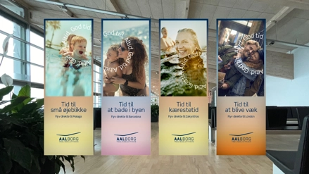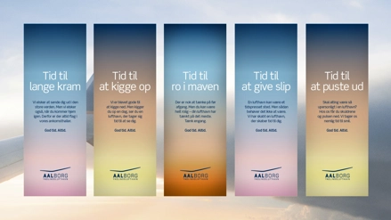 Aalborg Lufthavn tager sig ekstra god tid. Tid til at sende os godt afsted. Ud i den store verden på alt lige fra den korte business-tur til storbyseventyr til charterferie – men også tid til at få os godt hjem igen. De tager sig ekstra god tid til at se os og møde os. Med åbne øjne og åbne arme. De tager sig ekstra god tid, så vi får tid. Tid til yndlingsøjeblikke.